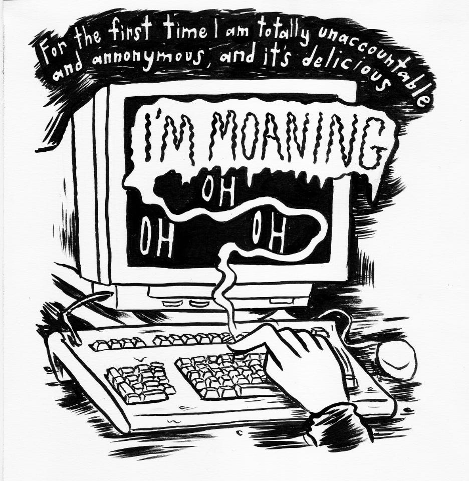 I have cybersex in an MIRC chatroom with a person who says he is a 21-year-old musician from Long Beach, California. Dreamy. He tells me he is lifting my hips up so he can get deeper inside me. This is the most exciting sexual detail I have ever heard. I’m moaning, I tell him. I do not tell him I’m a 12-year-old in rural Australia or that I’m here for my studies. For the first time I am totally unaccountable and anonymous, and it’s delicious. The time machine knows that in the future children will be able to access encyclopedias and news and watch real people fucking on their phones but I don’t care with one hand typing oh oh oh and the other in my knickers. The time machine’s promises stretch out across centuries of bright possibility. Then we all have the same thought. Hang on, what if I … Then we forget what we are thinking and shoot forwards through time. The journey is gleeful, ecstatic. By the time I withdraw my hand the moisture has dried into a film. My fingers are fused into a button-tapping hook.